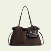Elevate your everyday elegance with this luxurious suede shoulder bag in rich brown. Crafted from premium suede, it features a soft, cloud-like silhouette that drapes gracefully from the shoulder. The refined design balances comfort with understated sophistication, making it an effortless companion for both professional settings and leisurely outings. Its generous capacity accommodates your essentials while maintaining a polished aesthetic. A timeless investment piece that seamlessly transitions from day to evening. A separate pouch will be included.